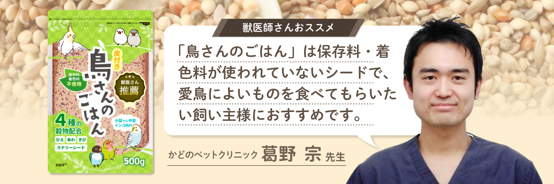 当店の商品「鳥さんのごはん」は現役獣医師かどのペットクリニック葛野宗先生の推薦を受けております!