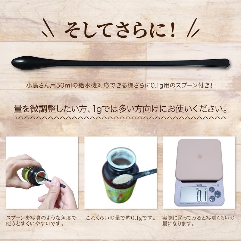 50mlのお水の場合付属の黒スプーンすりきり一杯をお水に溶かしてください。 または餌にふりかけるなど少量を継続的に長期間与えるのがおススメです。 透明スプーンは250㏄のお水にスプーン一杯のネクトンを溶かしてください。 ペレットと併用も可能ですが、栄養過多になることもある為、ご不安な方は獣医にご相談ください。 |